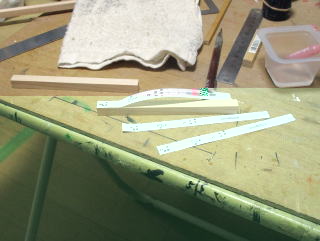 | ほぞ穴位置を記した台脚の型紙、 | 台脚に貼り付ける | 四面ともずれないように糊で貼る、 |