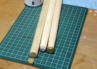 | 舁き棒材料 ・ 檜丸棒、 | 先端先細りの大きさのサイズの紙を貼る | 旋盤で先細りに加工する、 |