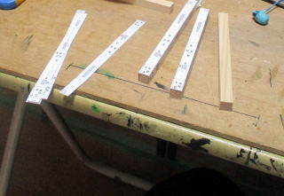 | ほぞ穴位置を記した台脚の型紙、 | 台脚に貼り付ける | 四面ともずれないように糊で貼る、 |