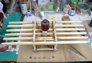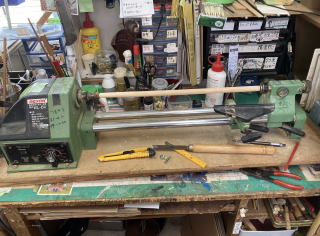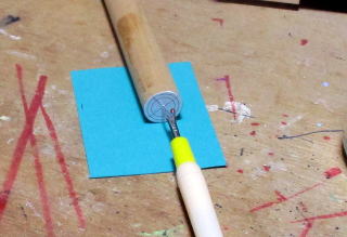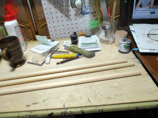 | 舁き棒材料 ・ 檜丸棒、 | 先端先細りの大きさのサイズの紙を貼る | 旋盤で先細りに加工する、 |